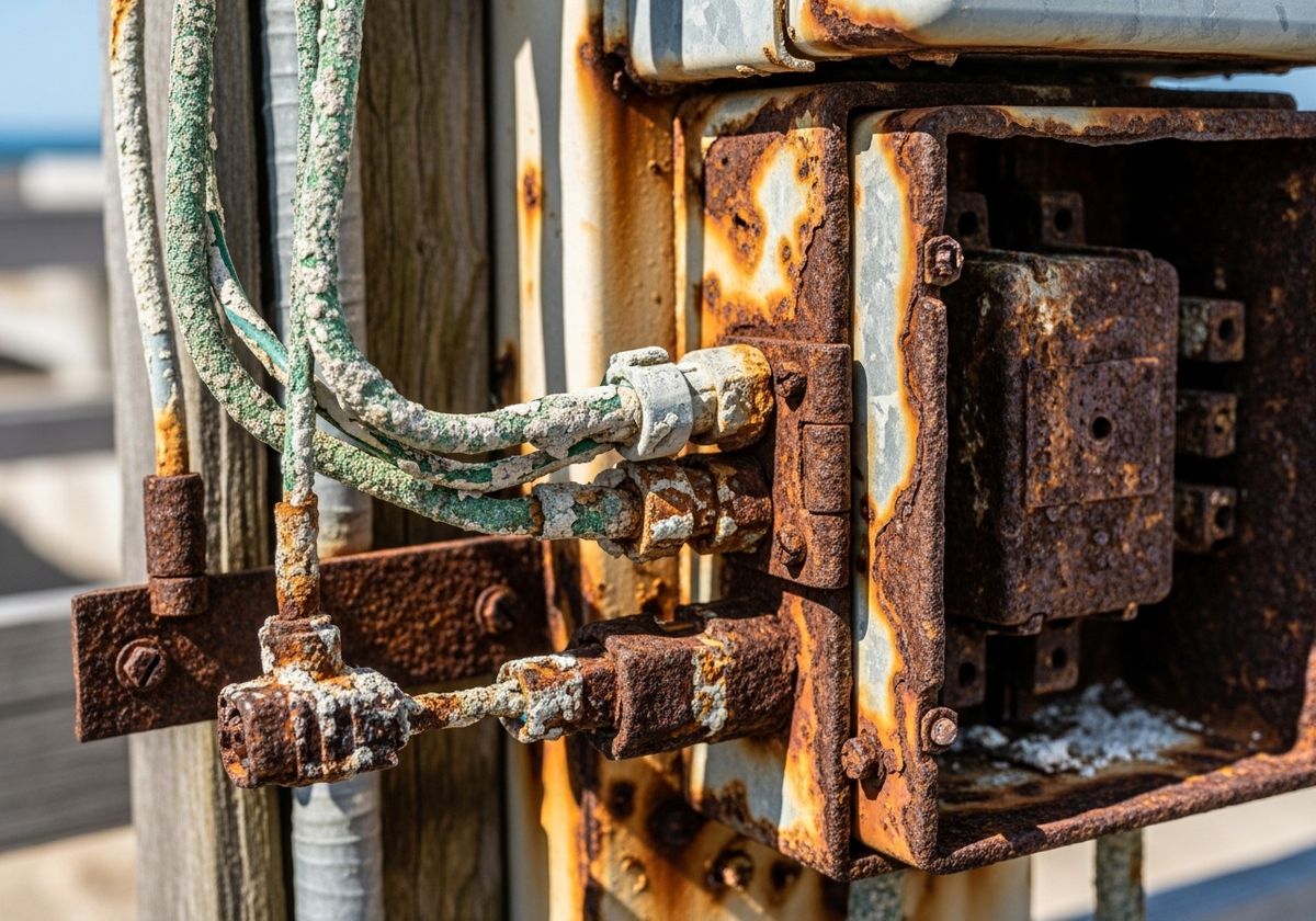 Salt air contains chloride ions that deposit on metal surfaces. These ions attract moisture, creating an electrolyte solution that facilitates electrochemical reactions, leading to corrosion. This process affects various electrical components, including wiring, conduits, connectors, and electrical panels. Over time, corrosion can compromise the integrity of these components, leading to malfunctions and potential safety hazards.